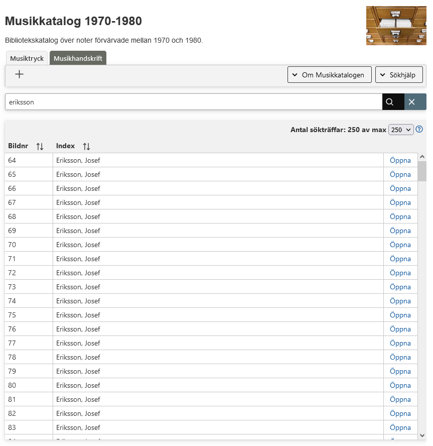 Vid en sökning presenteras sökresultatet i en skrollbar lista. Samtidigt komprimeras sökformulärets detaljerade delar ihop för att ge träffresultatet mer plats. Genom att hovra med muspekaren över Öppna-länken visas en förhandsvisning av kortet. Genom att klicka på Öppna kommer man till bläddringsvyn där det sökta kortet visas.